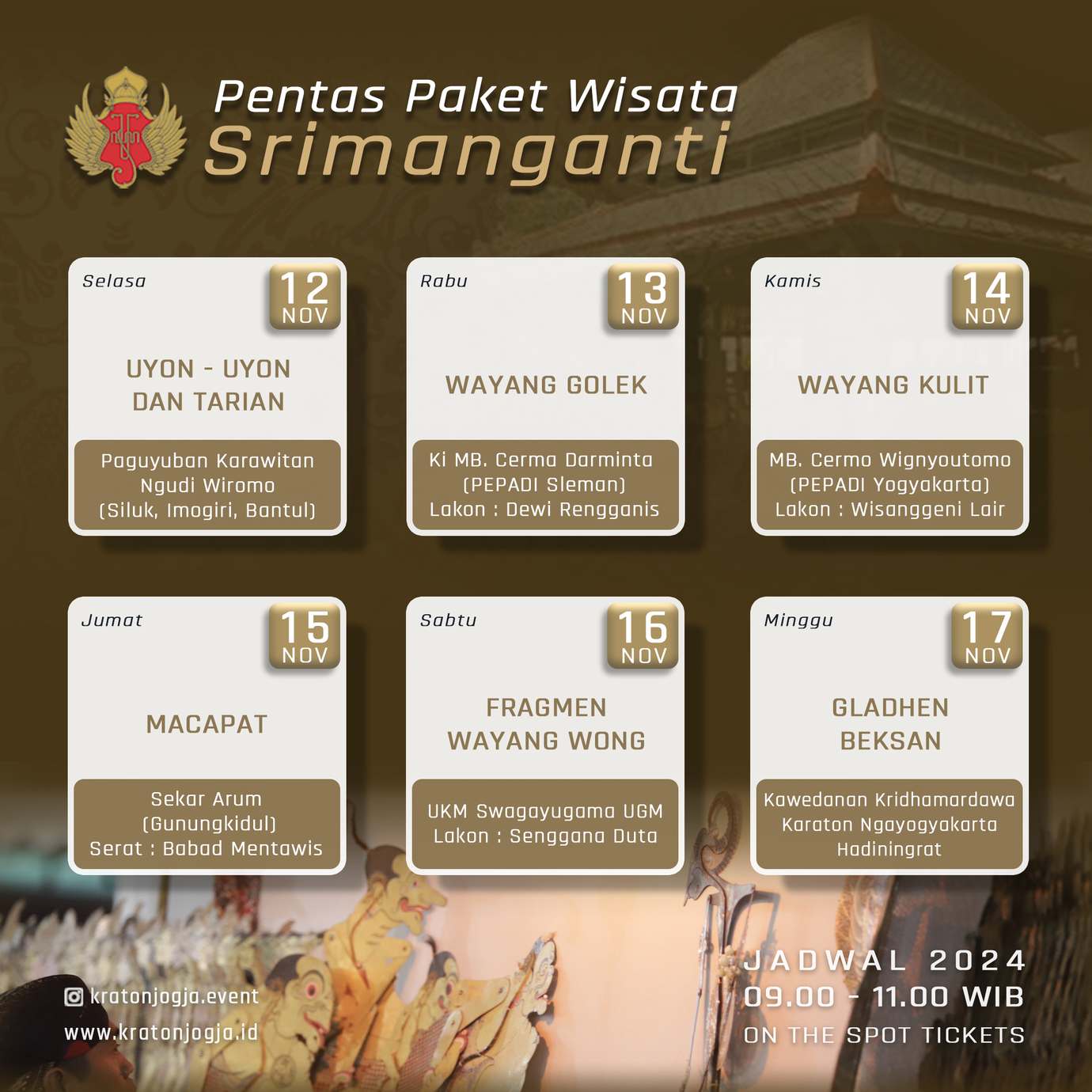 Pementasan ini dapat disaksikan langsung di Bangsal Srimanganti Keraton Yogyakarta, dengan membeli tiket masuk Museum Kedhaton Keraton Yogyakarta yang berada di area Kamandhungan Lor (plataran Keben).