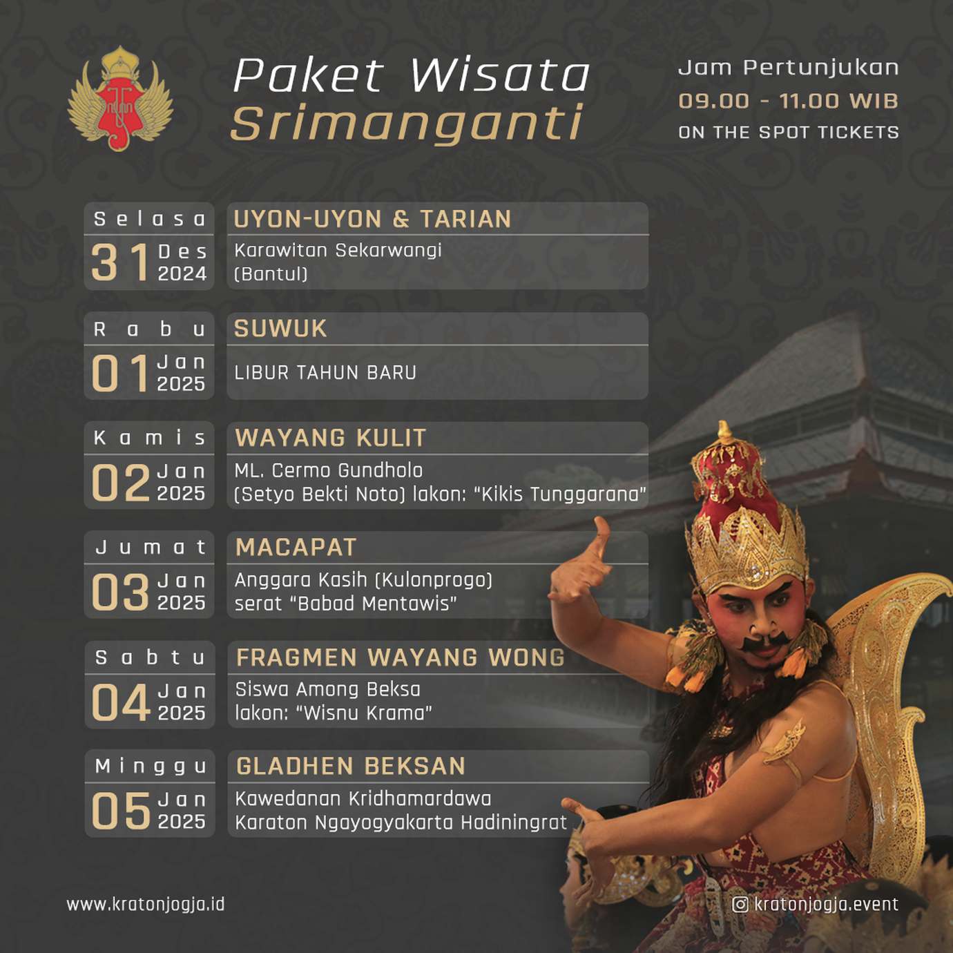 Pementasan ini dapat disaksikan langsung di Bangsal Srimanganti Keraton Yogyakarta, dengan membeli tiket masuk Museum Kedhaton Keraton Yogyakarta yang berada di area Kamandhungan Lor (plataran Keben).