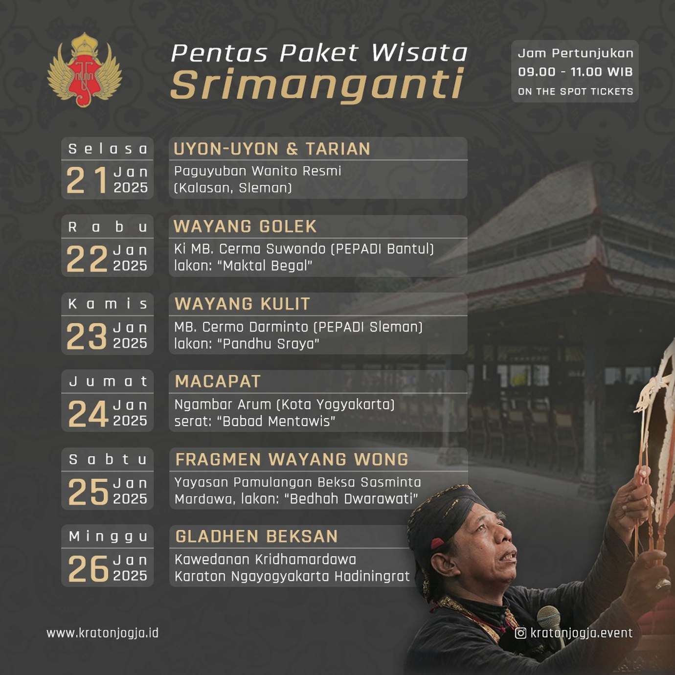 Pementasan ini dapat disaksikan langsung di Bangsal Srimanganti Keraton Yogyakarta, dengan membeli tiket masuk Museum Kedhaton Keraton Yogyakarta yang berada di area Kamandhungan Lor (plataran Keben).