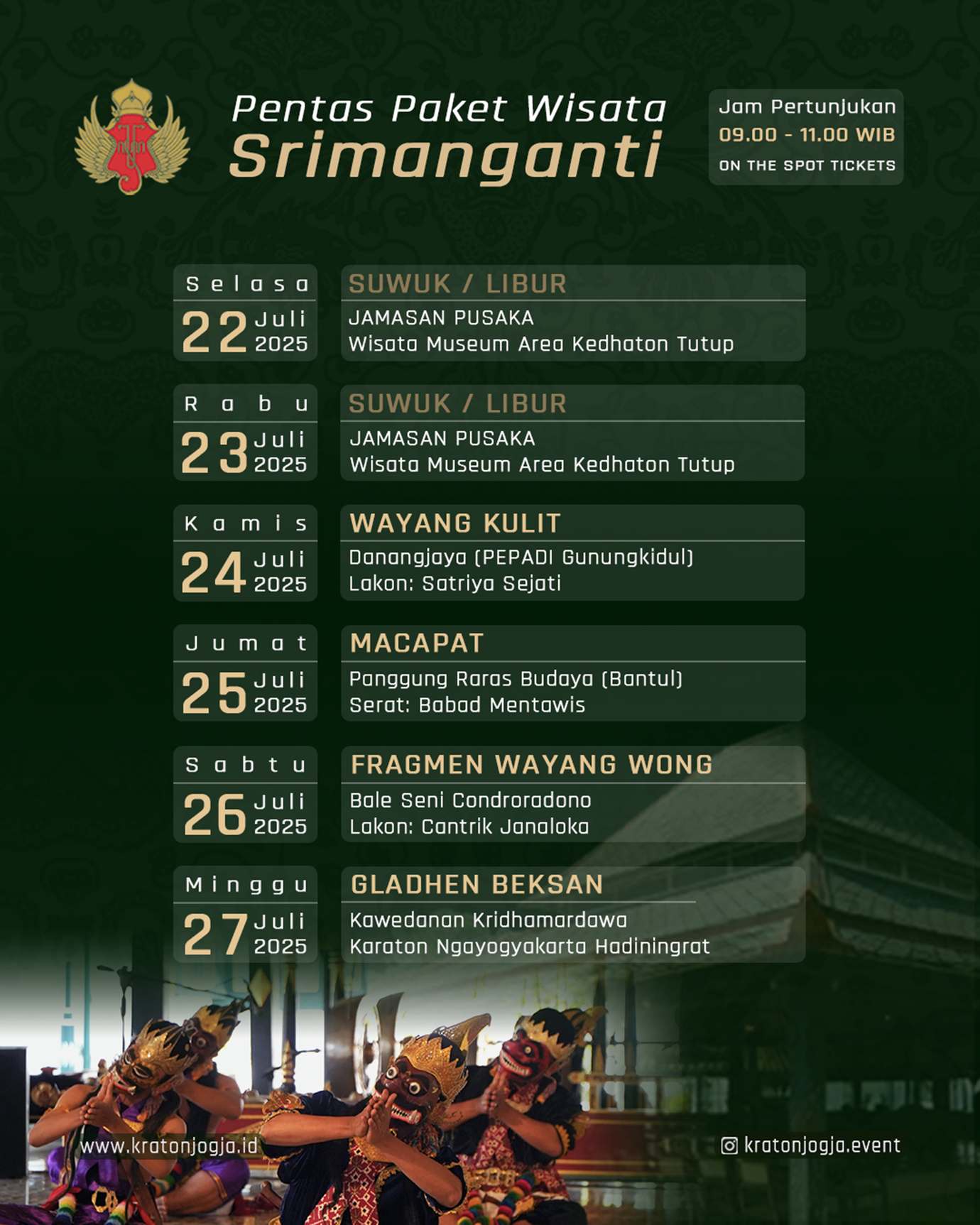Pementasan ini dapat disaksikan langsung di Bangsal Srimanganti Keraton Yogyakarta, dengan membeli tiket masuk Museum Kedhaton Keraton Yogyakarta yang berada di area Kamandhungan Lor (pelataran Keben).