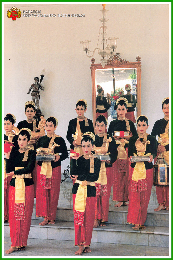Yang membawa benda-benda pusaka tersebut adalah para gadis yang disebut dengan istilah Manggung. Para Manggung biasanya merupakan kerabat dekat Sultan yang disebut dengan istilah Sentana Dalem. Terdapat delapan Manggung yang masing-masing bertugas membawa benda-benda pusaka di atas. Mereka berjalan berjajar berirringan di depan Sri Sultan pada saat miyos dari Dalem Ageng Prabayeksa menuju Sitihinggil Lor. Sementara itu, terdapat dua Manggung yang berjalan di belakang Sri Sultan untuk membawa benda pusaka lainnya yang berupa Kecohan (tempat meludah) dan Wadah Ses (tempat rokok). Dengan demikian terdapat total sepuluh Manggung yang bertugas mengiringi Sri Sultan pada saat digelar suatu upacara besar.